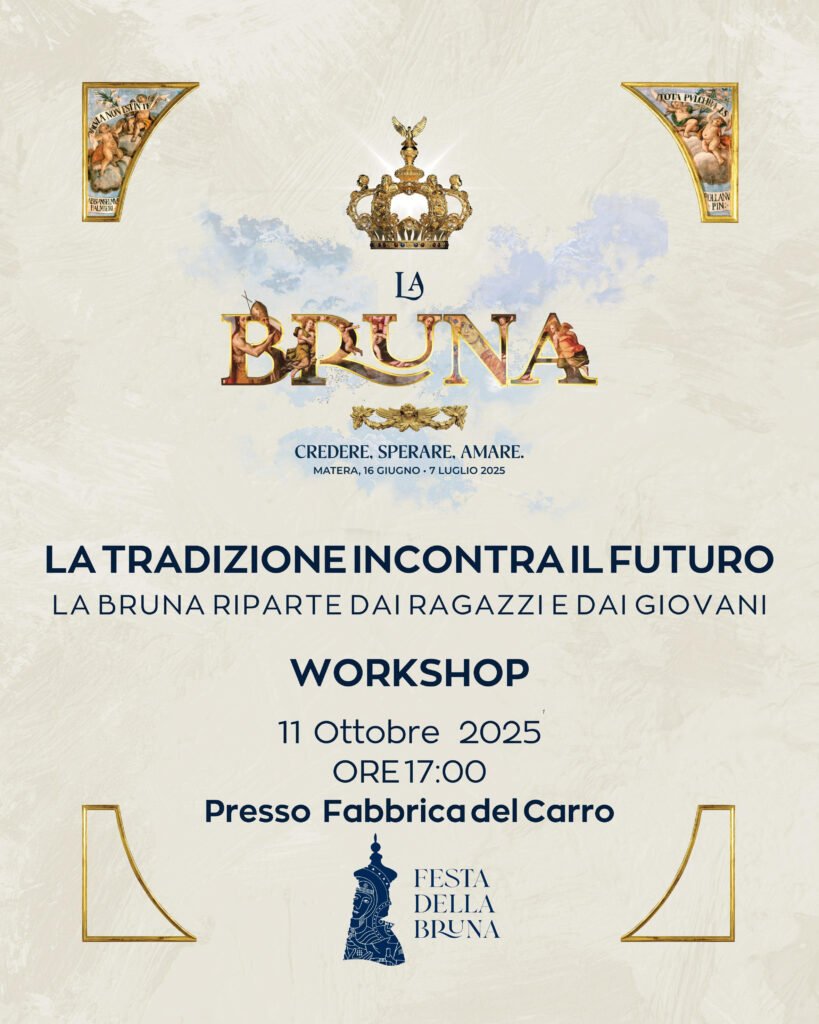 La Festa della Bruna è il filo che cuce insieme le generazioni di Matera. Perché questo filo resti vivo, servono energie nuove e sguardi capaci di futuro. Dopo la recente nomina di Bruno Caiella a Presidente per il terzo mandato, l’Associazione Maria SS. della Bruna compie un gesto concreto: ripartiamo davvero dai giovani, inaugurando, sabato 11 ottobre alle 17 nella Fabbrica del Carro, il secondo appuntamento del Workshop creativo della comunità, un percorso mensile di ascolto, incontro e progettazione condivisa. È il primo passo di un cammino fatto di novità che annunceremo nei prossimi mesi.
