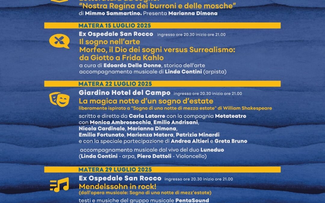 Dopo la serata dell’8 luglio, il festival proseguirà il 15 luglio alle ore 21 nel cortile dell’ex Ospedale San Rocco, con “Il Sogno nell’arte. Morfeo, il dio dei sogni vs Surrealismo: da Giotto a Frida Kahlo” a cura di Edoardo delle Donne e con l’accompagnamento musicale dell’arpista Linda Contini.