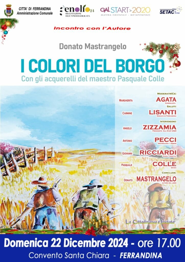 Un viaggio alla scoperta di Ferrandina, tra cultura, arte e tradizioni, rileggendo la storia del paese in una chiave innovativa che guarda al futuro secondo le matrici della sostenibilità ambientale, sociale ed economica. E’ il libro scritto dal giornalista Donato Mastrangelo e impreziosito dagli acquerelli dell’artista Pasquale Colle, edito da Setac, che verrà presentato in anteprima domenica 22 dicembre alle ore 17, nel monastero di Santa Chiara nell’ambito dell’evento “Enolio 2024” organizzato dall’Amministrazione Comunale di Ferrandina in collaborazione con il Gal Start 2020 e l’Associazione Nazionale Città dell’Olio.