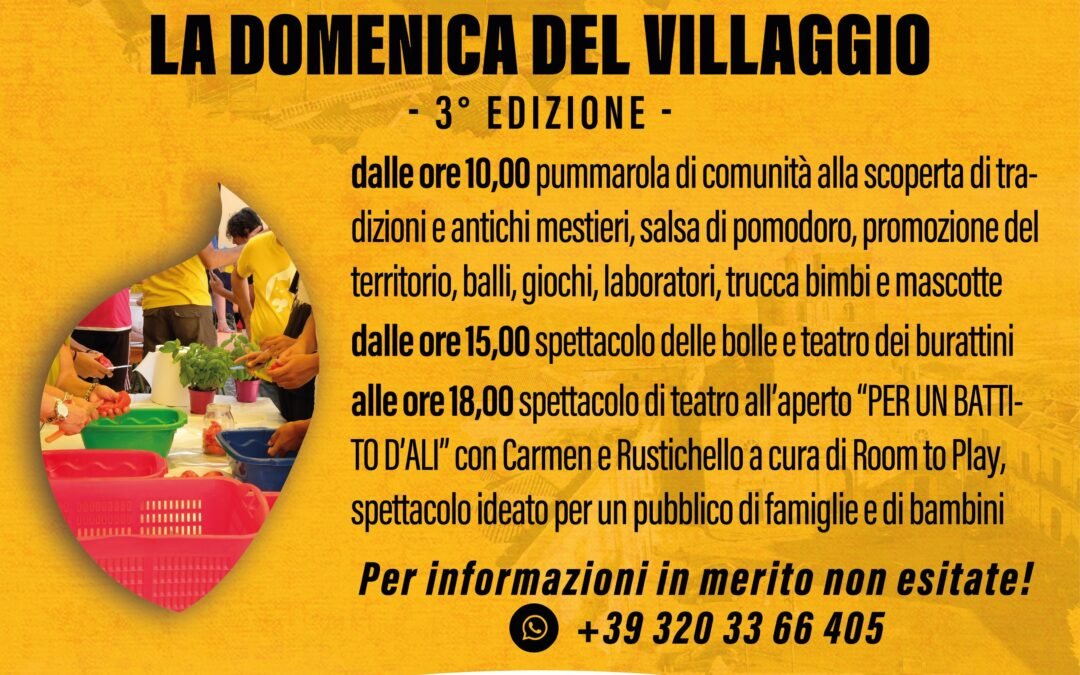 Domenica 21 settembre 2025, a partire dalle ore 10:00 presso Largo Purgatorio a Ferrandina (MT), torna “La Domenica del Villaggio”, evento gratuito e aperto a tutti, organizzato da Lo Scoiattolo APS con il patrocinio del Comune di Ferrandina, all’interno del cartellone estivo Estarte 2025.