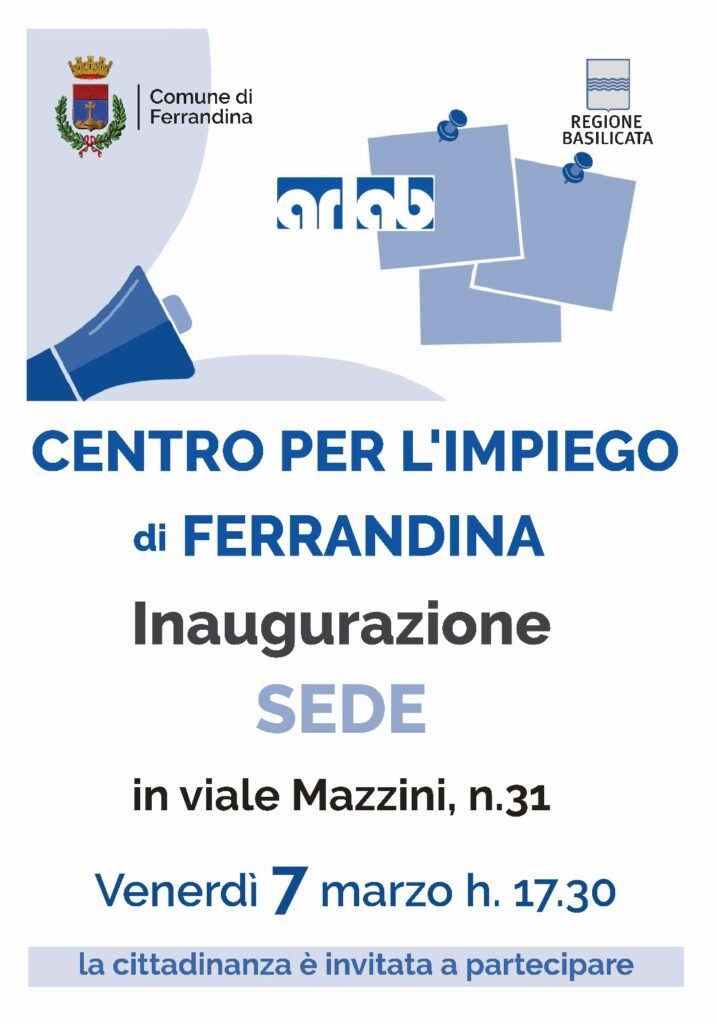 Venerdì 7 marzo, alle ore 17.30, si inaugura l’apertura della sede del Sub Centro per l’Impiego di Ferrandina, in viale Mazzini, n.31. Un momento che segna un importante traguardo per la comunità e rappresenta un significativo passo avanti nell’offerta di servizi per il lavoro nel territorio.