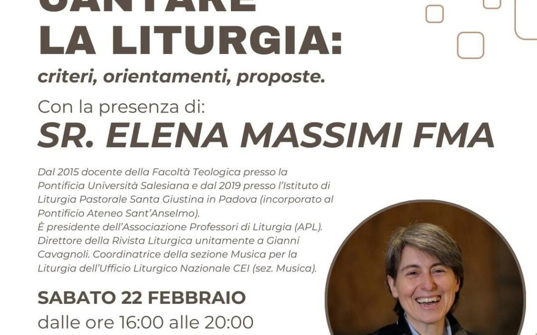Relatrice dell’incontro sarà Suor Elena Massimi FMA, docente di Liturgia presso la Pontificia Università Salesiana dal 2015 e dal 2019 anche presso l’Istituto di Liturgia Pastorale Santa Giustina di Padova.