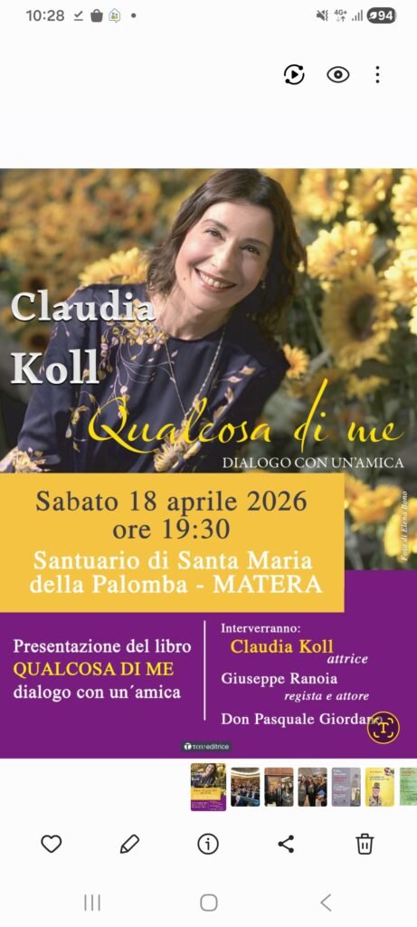 Sabato 18 aprile 2026, alle ore 19.30, nel Santuario di Santa Maria della Palomba, Claudia Koll sarà protagonista della presentazione del suo ultimo libro “Qualcosa di me – dialogo con un’amica“ (Tau editrice), in un incontro aperto al pubblico.