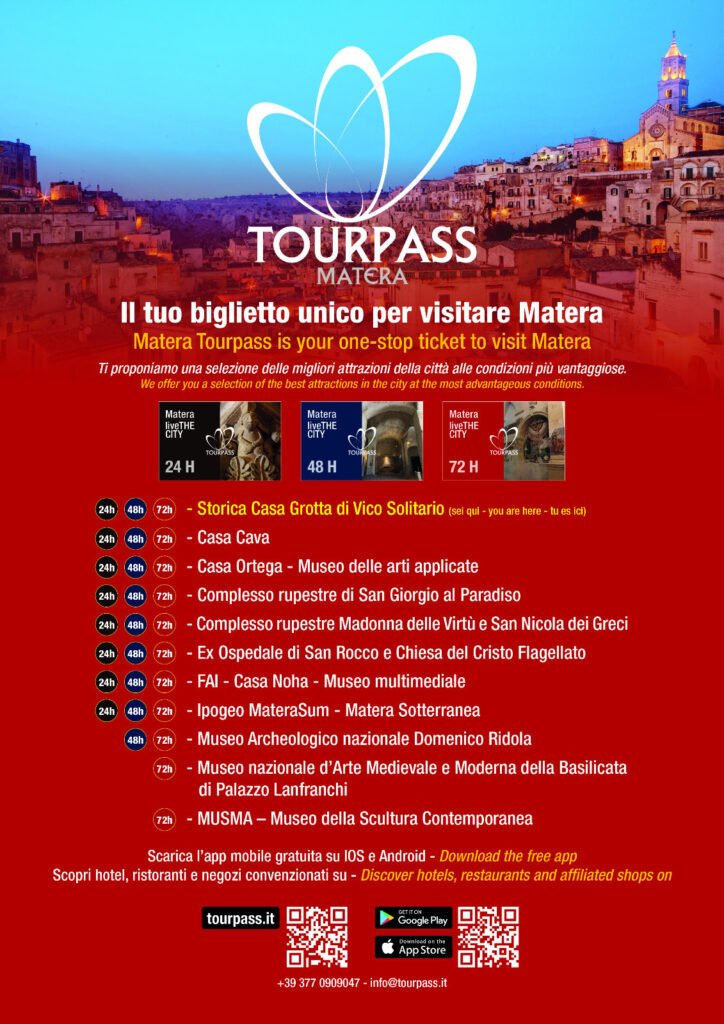 È disponibile online Matera Tourpass (www.tourpass.it), il nuovo biglietto turistico unico per l’offerta di una selezione di visite ad alcune tra le più importanti attrazioni della città dei Sassi e del suo territorio. L’iniziativa nasce dalla partnership di due operatori turistici di esperienza, Giuseppe Colucci ed Enzo Montemurro, che hanno unito le forze per creare un soggetto economico, rappresentato al momento da un’associazione in partecipazione di imprese.