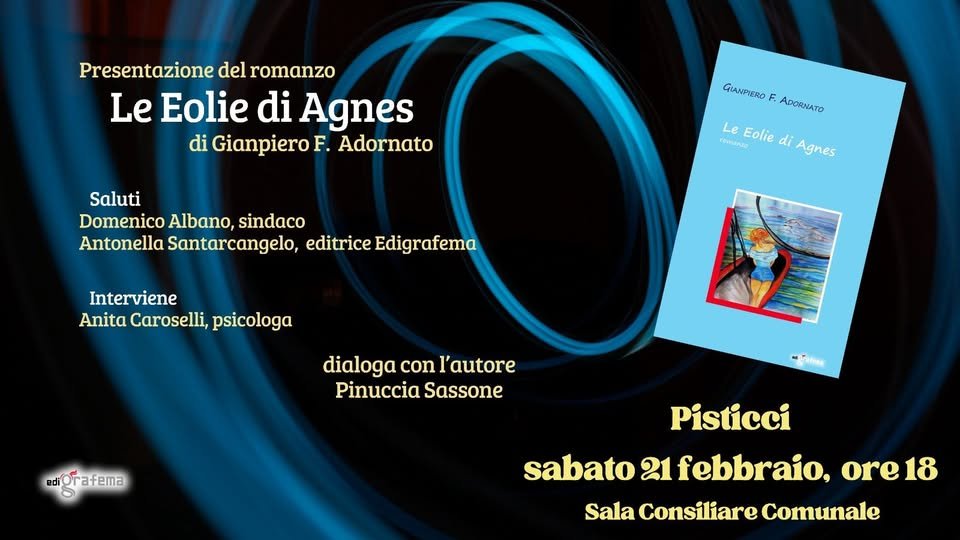 Il romanzo fresco di stampa “Le Eolie di Agnes” di Gianpiero Adornato verrà presentato a Pisticci sabato 21 febbraio, alle ore 18.00, nella Sala consiliare. Dopo i saluti del sindaco Domenico Albano e dell’editrice di Edigrafema Antonella Santarcangelo, interverrà la psicologa Anita Caroselli. Dialogherà con l’autore Pinuccia Sassone.