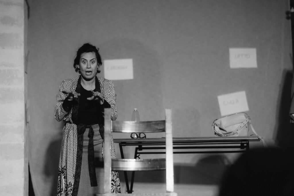 In scena Marienza Matera, attrice per passione, cresciuta nel teatro fin dall’adolescenza con la compagnia Hermes Teatro Laboratorio di Emilio Andrisani. Dopo esperienze di vita e lavoro all’estero, torna al palcoscenico seguendo nuovi percorsi formativi con Officine Eutopia fino ad approdare, nel 2024, a Metateatro, realtà che contribuisce ad arricchirne la maturazione artistica.