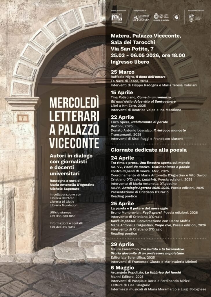 Gli incontri si terranno nella suggestiva Sala dei Tarocchi di Palazzo Viceconte (via San Potito 7), alle ore 18.00, con ingresso libero, offrendo al pubblico un’importante occasione di confronto e approfondimento letterario.