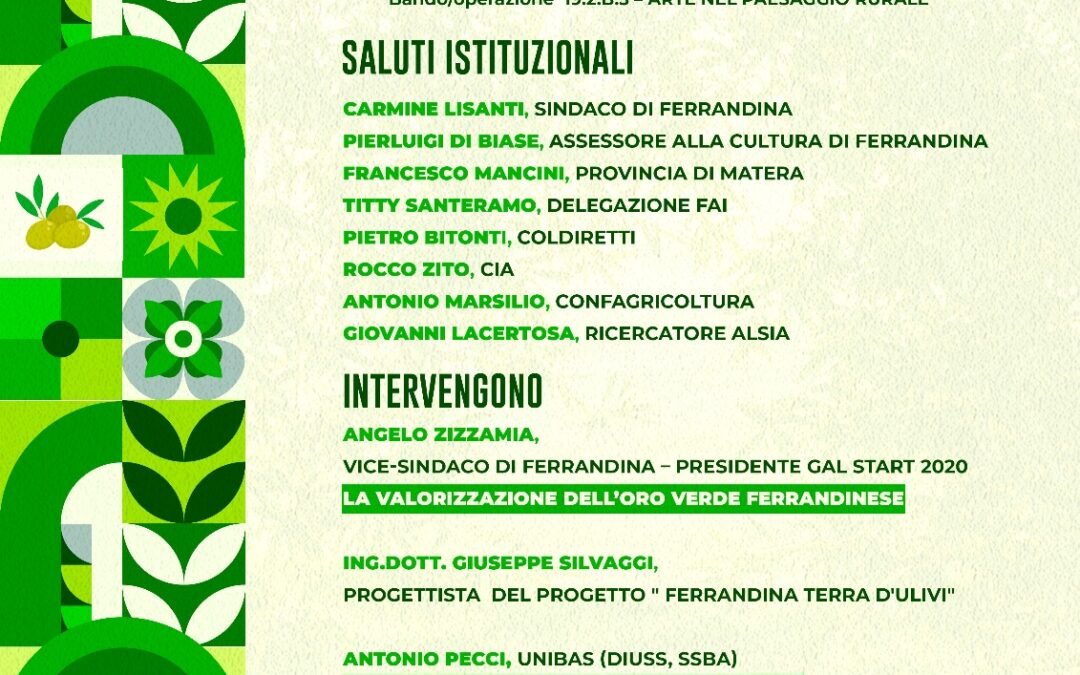 - Angelo Zizzamia, Vice-Sindaco di Ferrandina e Presidente del GAL Start 2020, che parlerà della valorizzazione dell’“oro verde” ferrandinese