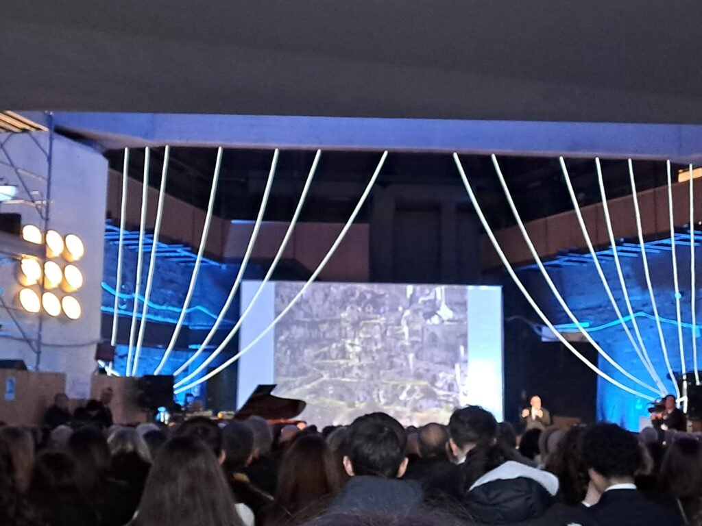 Predominano le sfumature del blu, i colori del Mediterraneo, in un’atmosfera avvolgente che rende il cantiere del teatro Duni, aperto eccezionalmente per l’occasione, magico e suggestivo. Le imperfezioni, le impalcature, i vuoti diventano un valore aggiunto per la cerimonia istituzionale di inaugurazione di Matera Capitale mediterranea della cultura e del dialogo 2026. Condotto dalla giornalista Valentina Bisti, l’evento di è aperto con un video diretto da Alessandro Rak e prodotto da Riva Dei Ginepri Production e Mad Entertainment Spa per MaTiFF – Matera International Film Festival – accompagnato dalle note di Mediterraneo di Mango.