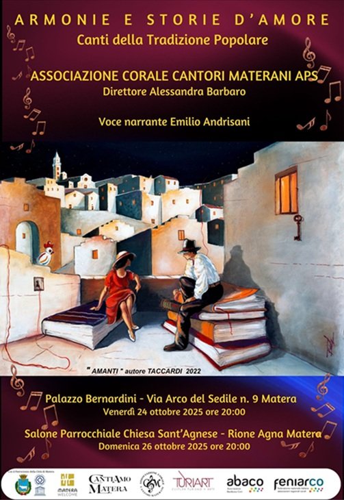 Una delle espressioni più antiche ed insieme più vive della cultura popolare è il canto; esso serve ad esprimere ogni tipo di sentimenti: dall’amore al dolore per il tradimento dell’amata, dalla gioia al lutto, dalla fatica del lavoro alla nostalgia per il proprio paese. Nel canto popolare, l’amore è un sentimento che si intreccia con la vita reale. Non è mai astratto, ma concreto, fatto di attese, di gesti, di parole sussurrate. Storie di un amore che resiste al tempo, che si tramanda, che si canta per non dimenticare. Ogni strofa è un frammento di cuore, ogni melodia è un abbraccio che attraversa le generazioni. Spesso cantati in lingua locale, rendono l’amore più intimo e vicino. Usati nelle serenate, nei matrimoni, nelle feste di paese, come rituale di passaggio. Nel canto popolare, l’amore si manifesta come forza vitale che unisce le persone e le comunità. Non è idealizzato, ma vissuto con intensità e dolore, con gioia e malinconia. La voce del popolo canta l’amore come esperienza condivisa, tramandata, che resiste. Con i concerti del 24 e del 26 ottobre, Il coro dei Cantori Materani diventa voce di un sentimento che attraversa il tempo e lo spazio, un viaggio immaginario nell’amore cantato nella migliore tradizione popolare della nostra bella Italia. “ARMONIE E STORIE D’AMORE” è parte integrante del cartellone musicale “CantiAmo Matera”, proposto alla città di Matera dall’ dell’Associazione Corale dei Cantori Materani Aps, con la realizzazione, durante tutto il 2025, di circa 15 eventi.