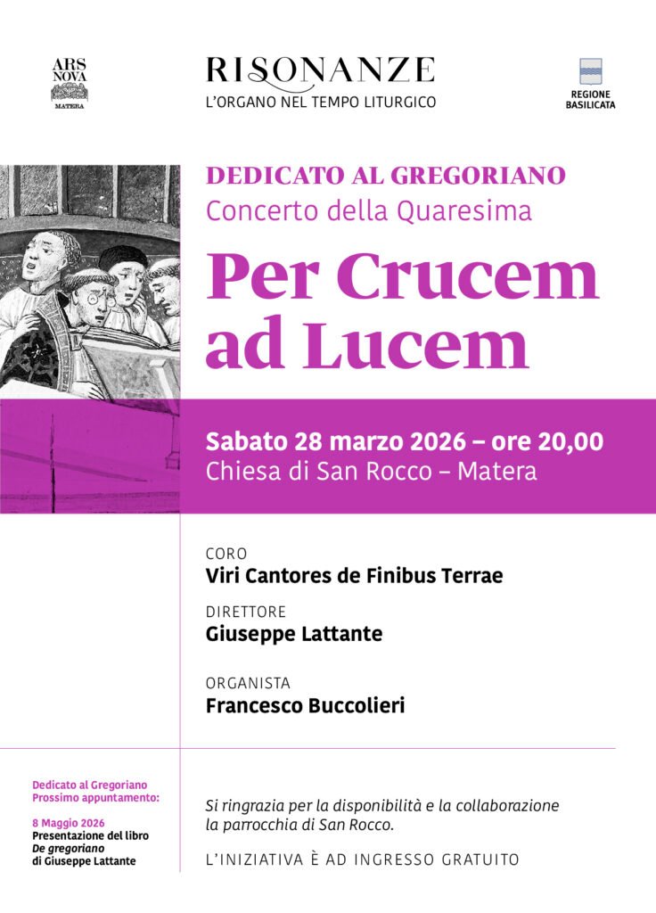 L’associazione Ars Nova Matera, nell’ambito del ciclo “Risonanze – L’Organo nel Tempo Liturgico”, propone il secondo appuntamento del ciclo Dedicato al Gregoriano con il Concerto della Quaresima “Per Crucem ad Lucem”, con il gruppo vocale “Viri Cantores de Finibus Terrae” diretto da Giuseppe Lattante, e l’organista Francesco Buccolieri.