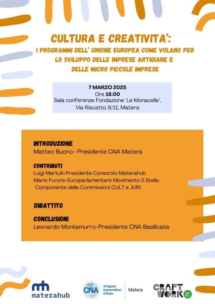 Nel pomeriggio, alle ore 18:00, sempre presso Le Monacelle, si svolgerà l’evento “Cultura e Creatività – I programmi dell’UE come volano per lo sviluppo delle imprese artigiane e delle micro-piccole imprese”, organizzato da CNA in collaborazione con Materahub. L’incontro offrirà un’importante occasione per approfondire il ruolo dei programmi europei nel supportare la crescita delle imprese artigiane e delle micro-piccole imprese, fornendo strumenti concreti per il loro sviluppo.