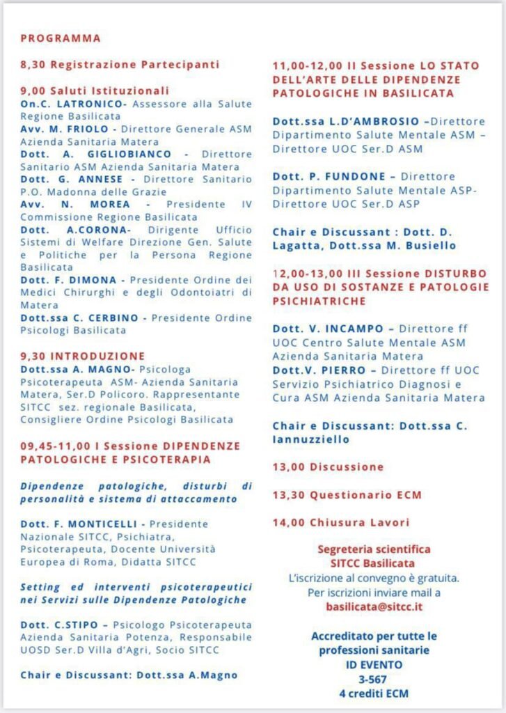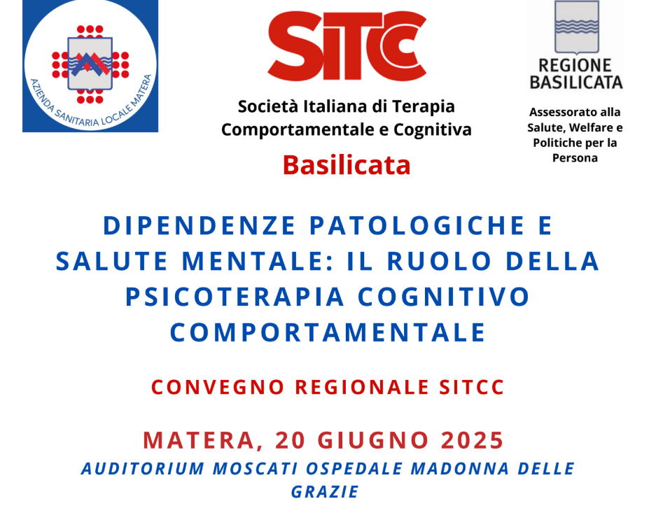 “Dipendenze patologiche e salute mentale: il ruolo della Psicoterapia cognitivo-comportamentale” è il titolo del convegno promosso dall’Azienda Sanitaria Locale di Matera che avrà luogo venerdì 20 giugno a partire dalle ore 9, nell’auditorium dell’Ospedale Madonna delle Grazie. Ospite d’onore sarà il prof. Fabio Monticelli, Presidente Nazionale della Società Italiana di Terapia Comportamentale e Cognitiva, Psichiatra Psicoterapeuta e docente presso l’Università Europea di Roma.