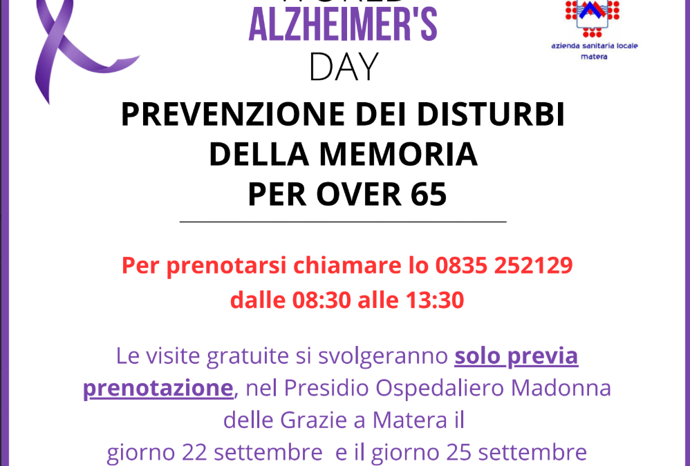 In occasione del mese di settembre dedicato alla Malattia di Alzheimer, il Centro per i Disturbi Cognitivi e le Demenze (C.D.C.D.) di Matera organizza una giornata di prevenzione gratuita dedicata agli over 65 con valutazioni neuropsicologiche.