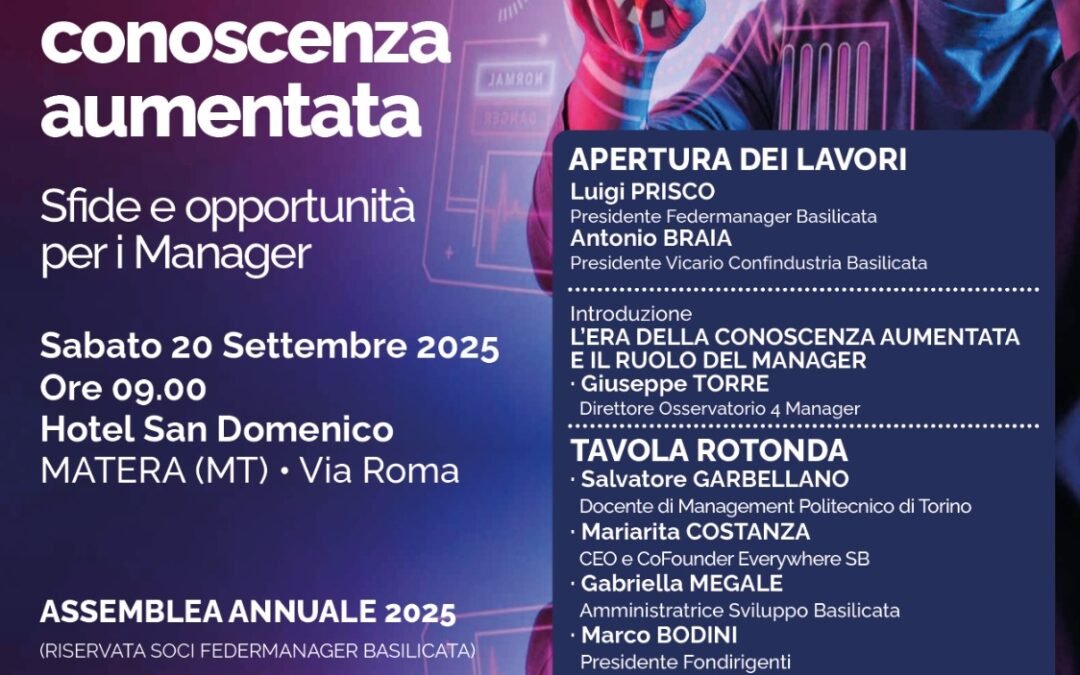 Sabato 20 settembre alle ore 9.00, nella sala conferenze dell’Hotel San Domenico di Matera, si terrà l’assemblea annuale di Federmanager Basilicata, dedicata al tema “I manager nell’era della conoscenza aumentata: sfide e opportunità per i manager”. Un incontro di riflessione e confronto che mette al centro le trasformazioni in atto, guidate da intelligenza artificiale, realtà aumentata e sistemi digitali avanzati, e il ruolo cruciale dei dirigenti in questa nuova fase economica e sociale. La giornata sarà aperta dagli interventi di Luigi Prisco (Presidente Federmanager Basilicata) e Antonio Braia (Presidente Vicario Confindustria Basilicata), seguiti dall’introduzione di Giuseppe Torre, direttore dell’Osservatorio 4 Manager, sull’importanza della conoscenza aumentata per la leadership. L’assemblea entrerà nel vivo con una tavola rotonda che vedrà la partecipazione di Valter Quercioli, Presidente nazionale Federmanager, Salvatore Garbellano, docente di management al Politecnico di Torino, che presenterà il progetto Reshoring Talents, Mariarita Costanza, CEO e CoFounder Everywhere SB, Gabriella Megale, Amministratrice di Sviluppo Basilicata, Marco Bodini, Presidente Fondirigenti.