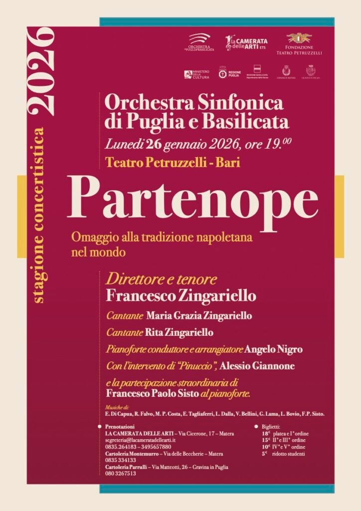 L’occasione è rappresentata dal concerto “Partenope – Omaggio alla tradizione napoletana nel mondo”, programmato al Teatro Petruzzelli e affidato all’Orchestra Sinfonica di Puglia e Basilicata, chiamata a esibirsi in una delle sale più prestigiose e simboliche del panorama musicale nazionale.