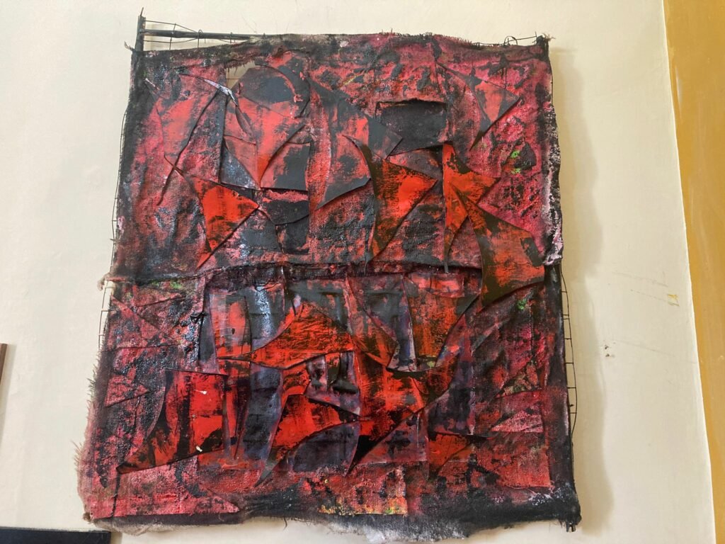 “Sono fissato con il dramma ambientalista” confida descrivendo una delle sue opere. “Penso che siamo ormai in una fase irreversibile: la natura non è più fatta da piante ma da pezzi di meccanica in cui il colore predominante è il nero, nero come il petrolio, come l’eccesso di sfruttamento delle risorse. Il vento trasporta invece il rosso che poi è il sangue della sofferenza del pianeta, composto da volani di condizionatori con sovrapposizione di penne, altri scarti e acrilici”.