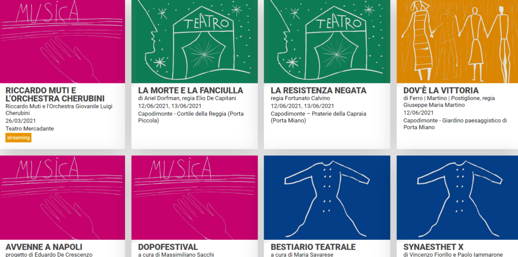 Gli altri eventi si svolgeranno nel Teatro Grande di Pompei, al Belvedere di San Leucio a Caserta, a Montesarchio (in piazza Umberto I e nel Museo Archeologico del Sannio Caudino), nel Teatro Naturale di Pietrelcina, nell’Anfiteatro di Avella e a Salerno, nel Chiostro del Duomo e all’esterno del teatro Ghirelli. Appuntamenti a Napoli ci saranno anche nell’Archivio di Stato di Napoli, nel Refettorio del Chiostro di San Domenico Maggiore, a Made in Cloister e, sempre a Capodimonte, nella Sala Causa. L’anteprima del 19 marzo con il Maestro Riccardo Muti si terrà al teatro Mercadante, mentre gli spettacoli di settembre andranno in scena in tre diversi teatri cittadini: il Bellini, il Trianon e il Politeama.