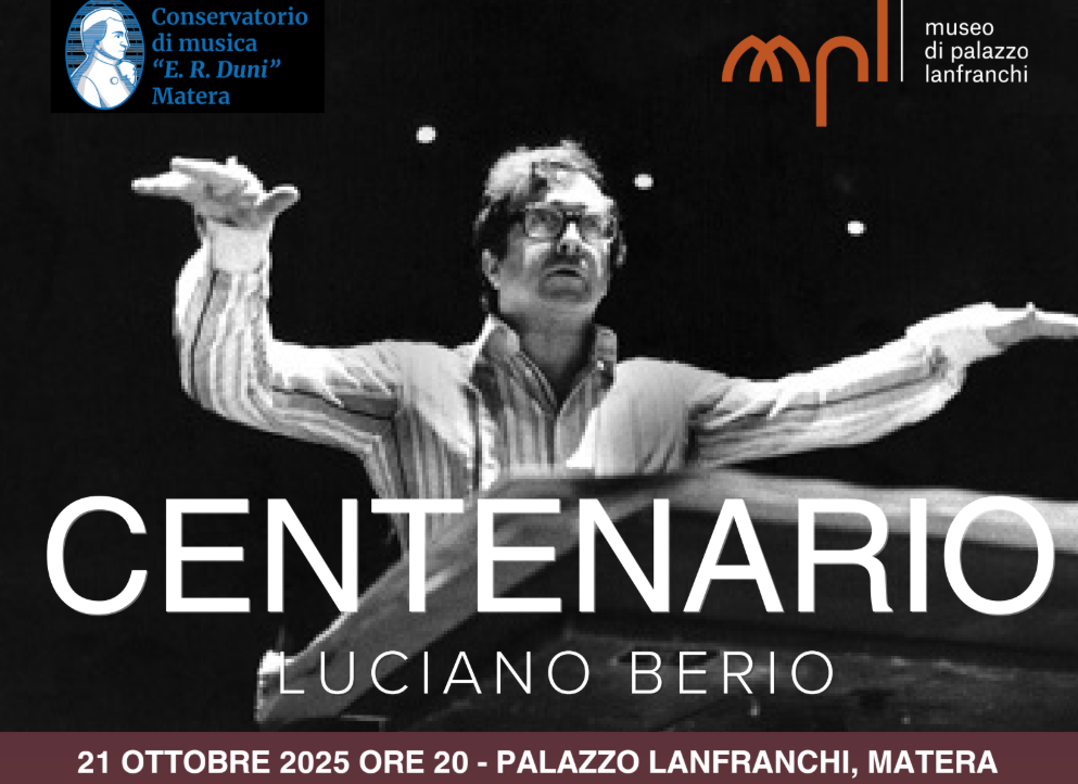 In occasione del centesimo anniversario della nascita di Luciano Berio – una delle figure più influenti della musica del Novecento – il Conservatorio “Egidio Romualdo Duni” di Matera dedica al grande compositore un concerto-evento di particolare suggestione, in programma martedì 21 ottobre, alle ore 20.00, ospitato nelle sale del Museo di Palazzo Lanfranchi.
