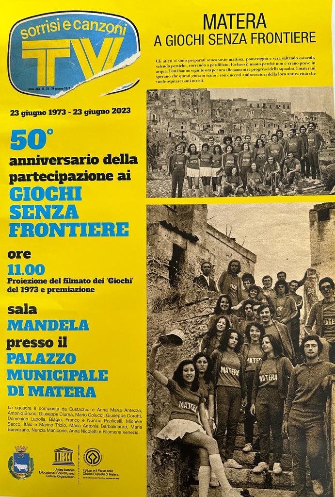 Nel 1973 i Sassi di Matera ospitarono un’edizione storica di “Giochi senza frontiere”. Alcuni protagonisti di questa straordinaria impresa saranno presenti domani (venerdì 23 giugno) alle ore 11, in una conferenza stampa presso la sala “Mandela” del municipio durante la quale saranno proiettati spezzoni del filmato sui giochi del ’73, tra salti a ostacoli, corsa e salite sulle pertiche. Sarà presente il sindaco, Domenico Bennardi, che premierà la squadra dei protagonisti ancora in vita, con medaglie riproducenti fedelmente quelle dell’epoca e le due date 1973-2023. Gli atleti originariamente erano 13, domani saranno guidati da Mario Colucci e presentati da Annarita Colucci.