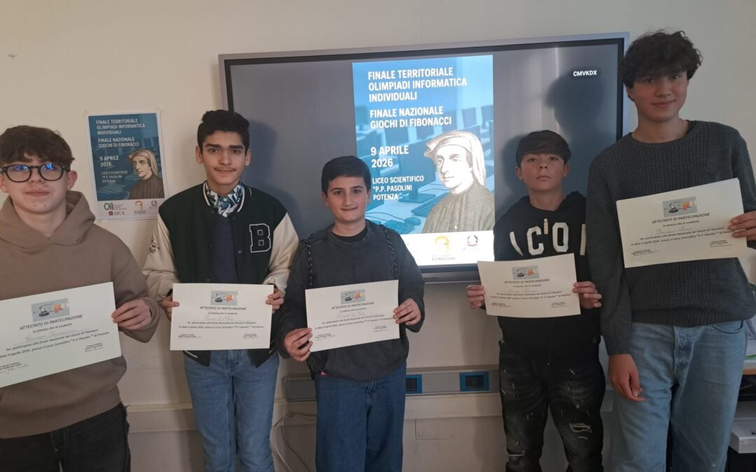 Si è conclusa giovedì 9 aprile, nella cornice del Liceo Scientifico “P.P. Pasolini” di Potenza, una giornata memorabile per la scienza e la tecnologia territoriale. L’evento ha visto lo svolgimento della Finale Territoriale delle Olimpiadi di Informatica Individuali e la prestigiosa Finale Nazionale dei Giochi di Fibonacci, segnando un traguardo eccezionale per i nostri alunni Antonio Di Pede e Nunzio Di Pede rispettivamente della classe II e della classe III sez. A del plesso don Milani e Luigi Tarasco, Giuseppe Santochirico e Francesco Sacco della III B del plesso Nicola Festa.