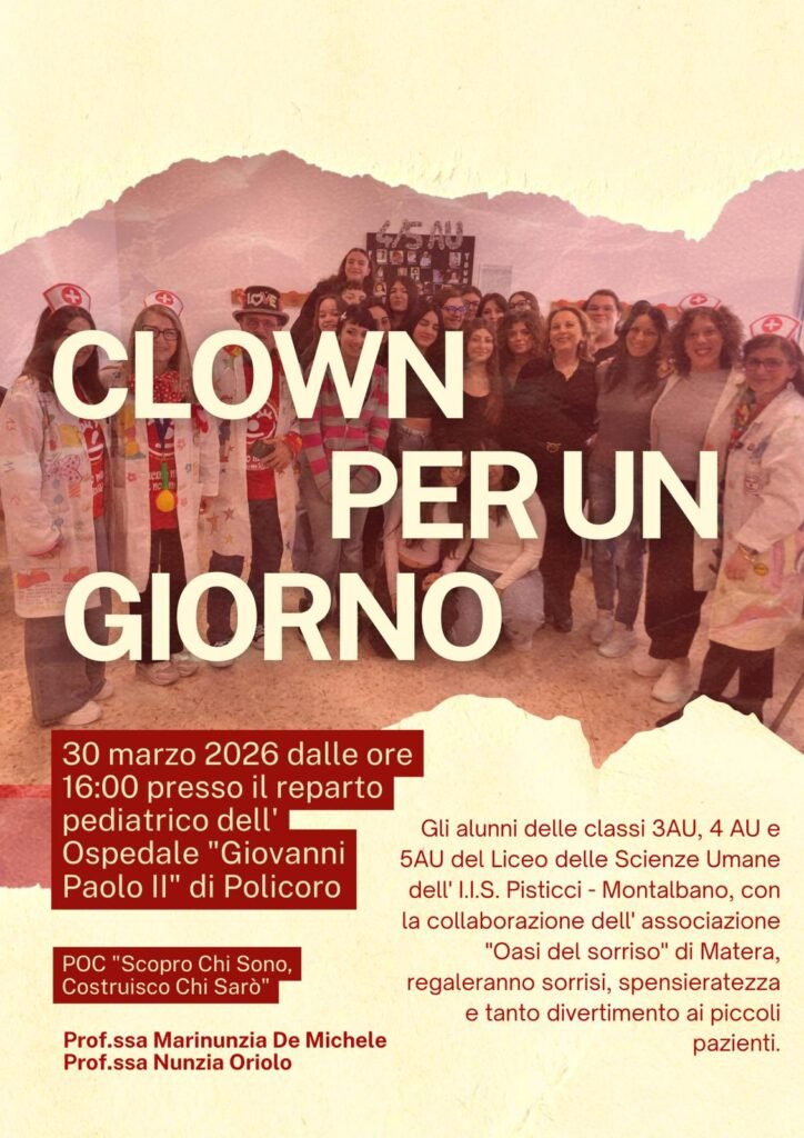 Si intitola “Clown per un giorno” l’iniziativa che si svolgerà il 30 marzo alle 16 presso il reparto pediatrico dell’Ospedale Papa Giovanni Paolo II di Policoro nell’ambito del POC “Scopro chi sono, costruisco chi sarò” a cura delle professoresse Marinunzia De Michele e Nunzia Oriolo. Gli alunni delle classi 3 AU, 4 AU e 5 AU del Liceo delle Scienze Umane dell’IIS Pisticci-Montalbano con la collaborazione dell’Associazione Oasi del sorriso Clownterapia e Musicoterapia regaleranno sorrisi, divertimento e tanta spensieratezza.