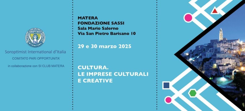 Il Comitato Pari Opportunità del Soroptimist International d’Italia, in collaborazione con il Soroptimist Club Matera, promuove e organizza due giornate di confronto e di esperienza nella città dei Sassi, dedicate alla cultura e ai suoi impatti nelle diverse espressioni della società, alle imprese culturali creative, al ruolo femminile nelle istituzioni e nelle organizzazioni culturali, anche attraverso uno sguardo trasversale e approfondito sulle politiche di genere connesso ad esperienze culturali.
