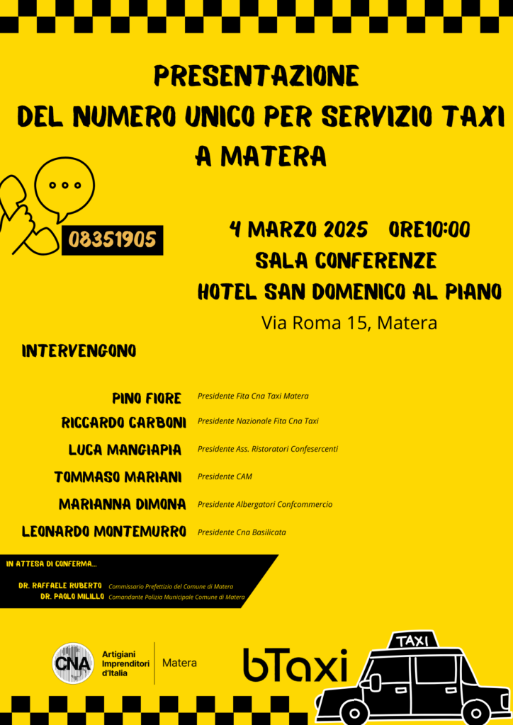 L’evento, promosso dalla CNA, rappresenta un passo significativo per la mobilità urbana di Matera, garantendo ai cittadini un servizio più accessibile e sicuro. L’introduzione del numero unico consentirà di semplificare il contatto con i taxi locali, migliorando la gestione delle chiamate e riducendo i tempi di attesa.