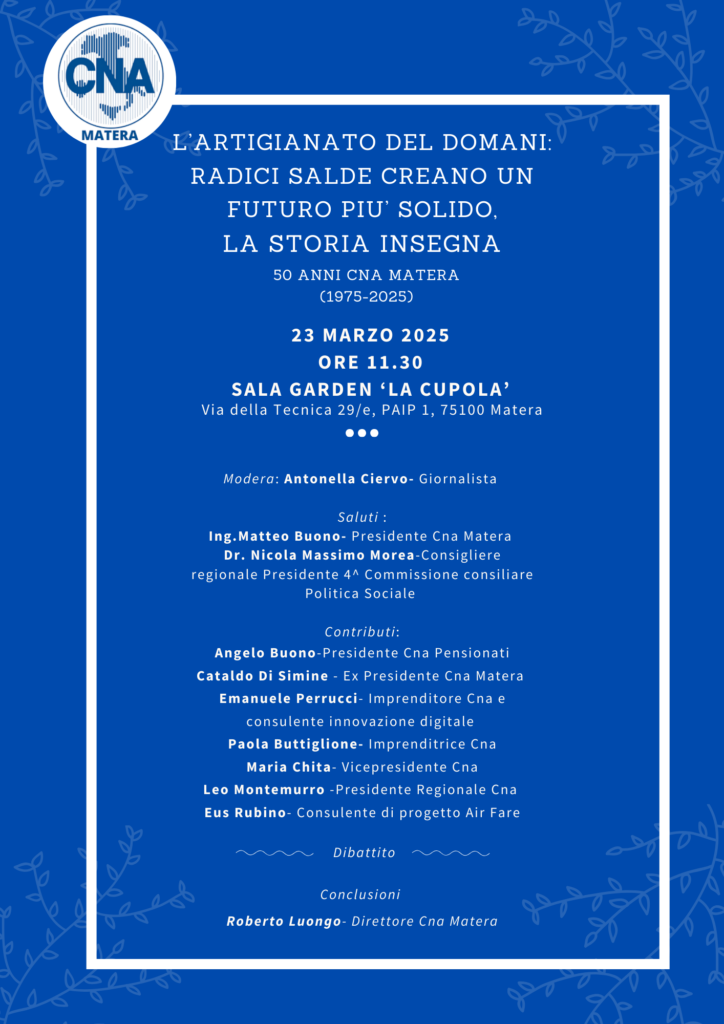 A moderare l’evento sarà la giornalista Antonella Ciervo. I saluti istituzionali saranno affidati a Ing. Matteo Buono, Presidente CNA Matera, e Dr. Nicola Massimo Morea, Consigliere regionale e Presidente della 4ª Commissione consiliare Politica Sociale.