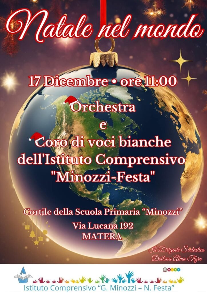 L’Istituto Comprensivo “G. Minozzi – N. Festa” invita le autorità civili e tutta la comunità al concerto “Natale nel Mondo”, che si terrà nel cortile della Scuola Primaria “Minozzi” in Via Lucana 192, nel cuore pulsante di Matera, martedì 17 dicembre 2024 alle ore 11:00. Protagonisti di questo evento unico saranno il coro di voci bianche diretto dalla prof.ssa Monica Petrara e l’orchestra diretta dal prof. Raffaele Esposto. Coro e orchestra sono pronti a trasportare il pubblico in un viaggio musicale attraverso le tradizioni natalizie di tutto il mondo.