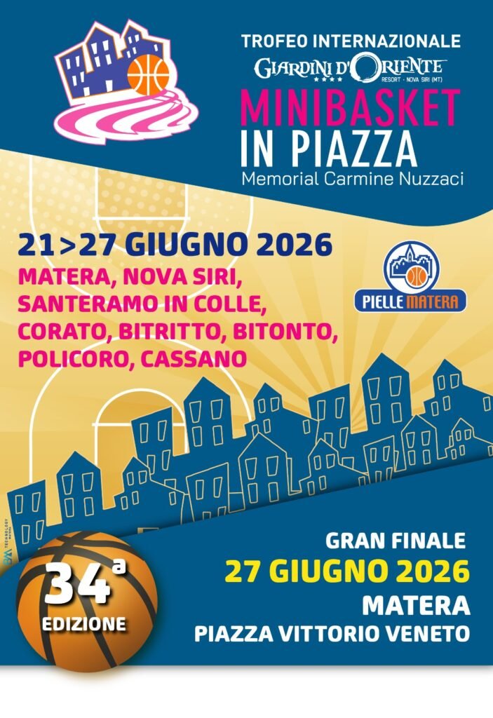 Iniziato il countdown per la 34° edizione del MiniBasket in Piazza. Mancano 100 giorni all’attesissimo appuntamento con il più grande evento internazionale cestistico dedicato ai piccolissimi atleti della palla a spicchi. Anche in questa edizione grande attenzione alla condivisione e all’amicizia tra i popoli, in un momento molto delicato per il mondo intero. Lo sport e la passione per la pallacanestro, faranno nuovamente da corollario a momenti di scambio di tradizioni e emozioni per oltre settecento miniatleti che torneranno ad invadere Matera e diverse città limitrofe lucane e pugliesi. Oltre alla città dei Sassi, anche per questa edizione sono previsti appuntamenti sportivi dislocati a: Nova Siri, Grottole, Santeramo in Colle, Cassano delle Murge, Bitonto, Corato, Bitritto e Policoro (novità di questa edizione).