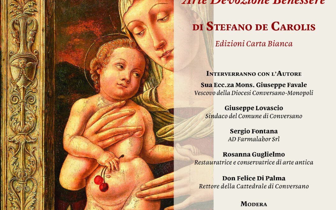 Con l’autore interverranno: S.E. Mons. Giuseppe Favale, Vescovo della Diocesi di Conversano Monopoli, Giuseppe Lovascio, Sindaco del Comune di Conversano, Sergio Fontana, AD. Farmalabor Srl, Rosanna Guglielmo, restauratrice e conservatrice di arte antica, Don Felice Di Palma, Rettore della Cattedrale di Conversano. Modera l’incontro il giornalista Antonio Lorusso.