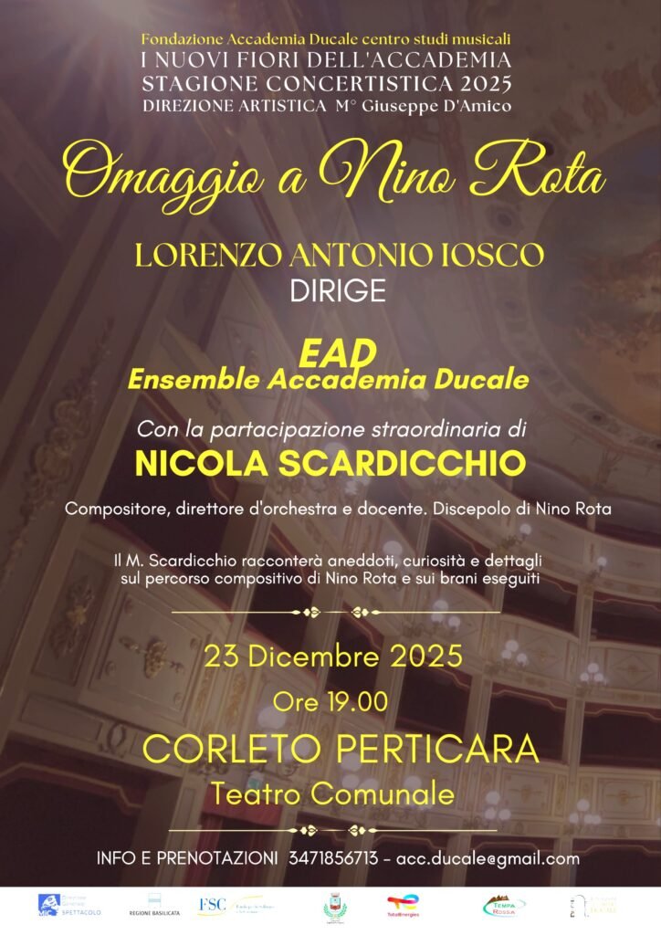 “Omaggio a Nino Rota” è il titolo del concerto promosso dall’Accademia Ducale Centro Studi Musicali in programma il 23 dicembre 2025 al Teatro comunale di Corleto Perticara. Il concerto dell’’Ensemble Accademia Ducale, sotto la direzione del suo direttore stabile, il Maestro Lorenzo Antonio Iosco, è realizzato grazie al sostegno della Joint Venture Tempa Rossa, costituita da TotalEnergies EP Italia, Mitsui E&P Italia B e Shell Italia E&P, che da anni affianca progetti rivolti alla crescita culturale e formativa del territorio lucano.