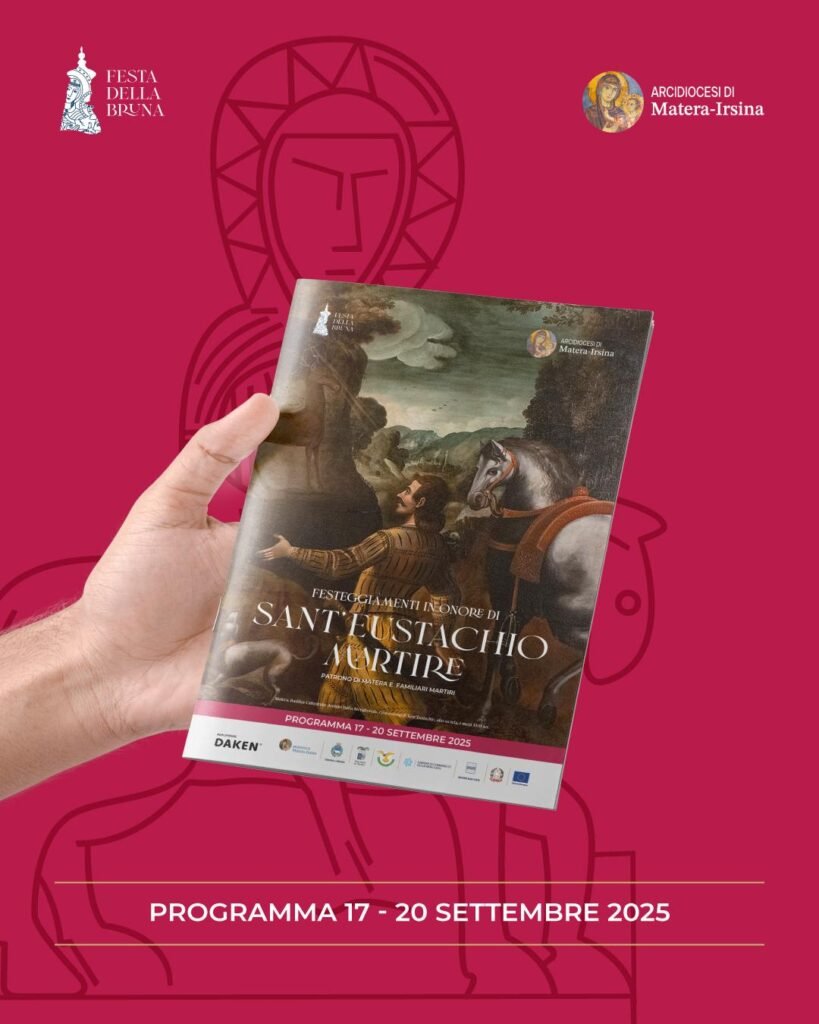 “La festa in onore di sant’Eustachio e familiari martiri ricorre il 20 settembre; – spiega Franco Moliterni, responsabile del settore Cultura dell’Associazione Maria SS. della Bruna – una festa celebrata a Matera con particolare solennità fino a pochi decenni or sono. Attualmente essa è preceduta da un triduo di preparazione, al quale sono invitate a partecipare tutte le coppie che nell’anno festeggiano il 25° ed il 50° anniversario del loro matrimonio. Il giorno della festa, poi, al mattino il patrono di Matera è onorato con una solenne concelebrazione; al pomeriggio, invece, con la partecipazione anche dei Cavalieri della Bruna appiedati, si porta in processione la statua in legno di tiglio, vestita con i ricchi abiti di un generale romano, realizzata dallo scultore Arcangelo Sperdicchio tra il 1799 ed il 1800, che lo raffigura con un volto assai espressivo su cui spiccano occhi e baffetti neri”.