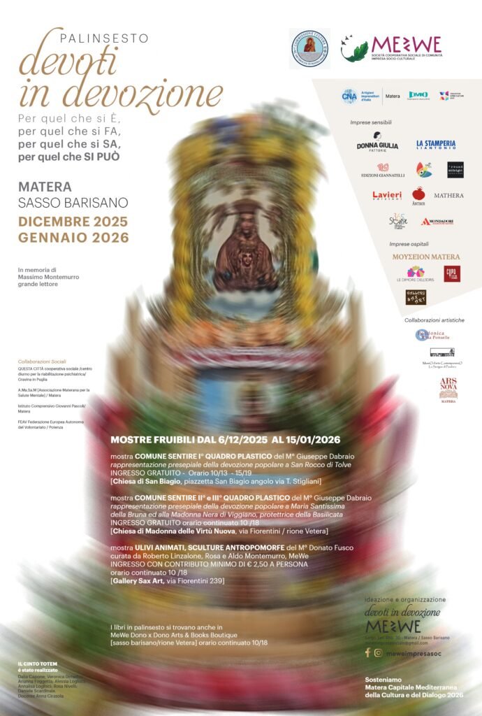 «Abbiamo inteso sostenere l’avvio operativo di Matera Capitale Mediterranea della Cultura e del Dialogo 2026 – spiega Paola Saraceno di Mewe – donando, come imprenditori devoti tanto all’economia della cultura e della creatività made in Sud, quanto agli aspetti comunitari, questo palinsesto che si compone di tre mostre d’arte e ventidue appuntamenti di rilievo. Vogliamo declinare la cultura come fatto sociale e identitario, valorizzare la filiera editoriale del Mezzogiorno, rendere fruibili chiese restaurate ma abitualmente chiuse e lì dare casa a Giuseppe Dabraio, presepista, a Michele Morelli, fotografo, a Donato Fusco, scultore di radici di ulivo del qui e ora, oltre che visibilità a studiosi, autori, artisti e poeti meridionali, che nutrono la nostra mente e proteggono dall’oblio immensi patrimoni materiali e immateriali.»