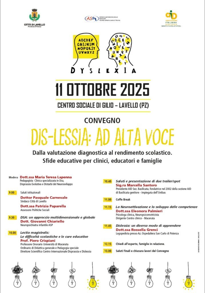 Sabato 11 ottobre c.m. ore 9:00, presso il centro sociale “M. Di Gilio” di Lavello, per la settimana della dislessia si terrà un Convegno di sensibilizzazione sul tema. Grazie al Sindaco Pasquale Carnevale e alla sua attenta e instancabile sensibilità sull’argomento, con l’ausilio dell’Assessore alle politiche sociali Patrizia Paparella, vede il patrocinio congiunto tra Comune di Lavello e ASP. La dislessia è molto spesso letta, in modo errato, come disabilità intellettiva, in realtà è clinicamente diagnosticata come una neurodiversità, che si manifesta come una differenza cognitiva e comportamentale, tipica dell’ essere umano. Il convegno è un’occasione per riflettere insieme, per condividere esperienze e costruire una comunità più attenta e supportiva per far emergere quel potenziale innato che ogni bambino possiede. La sensibilizzazione fa sì che tutta la comunità educante possa indossare quelle lenti blu, come la campagna nazionale posta in essere da AID, per uno sguardo diverso e inclusivo, capace di cogliere prospettive nuove e abilitanti. Prenderanno parte al convegno: il Dottor Giovanni Chiariello Neuropsichiatra di ASP, che curerà la parte emotiva e relazionale legata al disturbo in essere; il professor Piero Crispiani docente onorario dell’Università di Macerata e direttore del centro internazionale dislessia e disprassia, con un intervento legato alle difficoltà scolastiche e al concetto di cura; la Dottoressa Eleonora Palmieri, Psicologa Clinica e Neuropsicomotricista dell’età evolutiva, la quale tratterà un approfondimento sullo sviluppo delle funzioni motorie e la loro attivazione cognitiva. Interverrà inoltre la presidente di AID Basilicata sez. di Potenza, la signora Marcella Santoro, e con lei la dottoressa Rossella Grenci, logopedista del San Carlo, la quale terrà un intervento mirato sul modo diverso di apprendere. Infine, verrà dato spazio alle famiglie, ai docenti e ai clinici che vorranno intervenire per un proficuo confronto. Il convegno vedrà la partecipazione della Dottoressa Maria Teresa Lapenna, Pedagogista specializzata in Pedagogia Clinica, in qualità di Moderatrice, la quale si occupa di DSA e di tutti i disturbi legati al neurosviluppo, da oltre un decennio. La dislessia non deve essere vista come un limite, e questo momento di condivisione, dunque, deve indurci a capire che possiamo trasformare la stessa da difficoltà invisibile a valore condiviso, da stigma a consapevolezza, da isolamento a partecipazione.