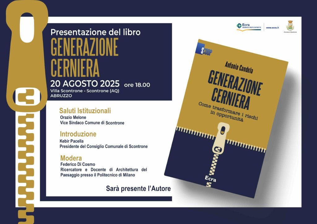 Il Comune di Scontrone ospiterà martedì 20 agosto 2025, alle ore 18.00, presso Villa Scontrone, la presentazione del libro Generazione Cerniera. Come trasformare i rischi in opportunità di Antonio Candela, edito da Ecra.