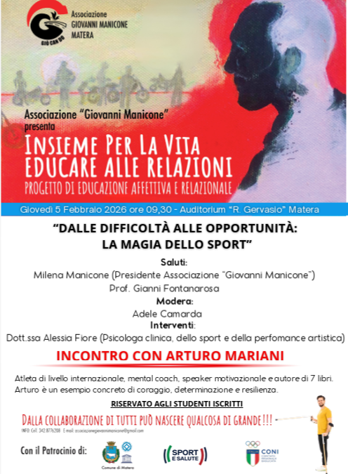L’Associazione “Giovanni Manicone” presenta un nuovo incontro del progetto “Insieme per la Vita – Educare alle Relazioni”, il 5 febbraio presso l’Auditorium “R. Gervasio” di Matera, un percorso di educazione affettiva e relazionale rivolto agli studenti della scuola secondaria di primo, che pone al centro il valore delle emozioni, delle relazioni e della crescita personale.
