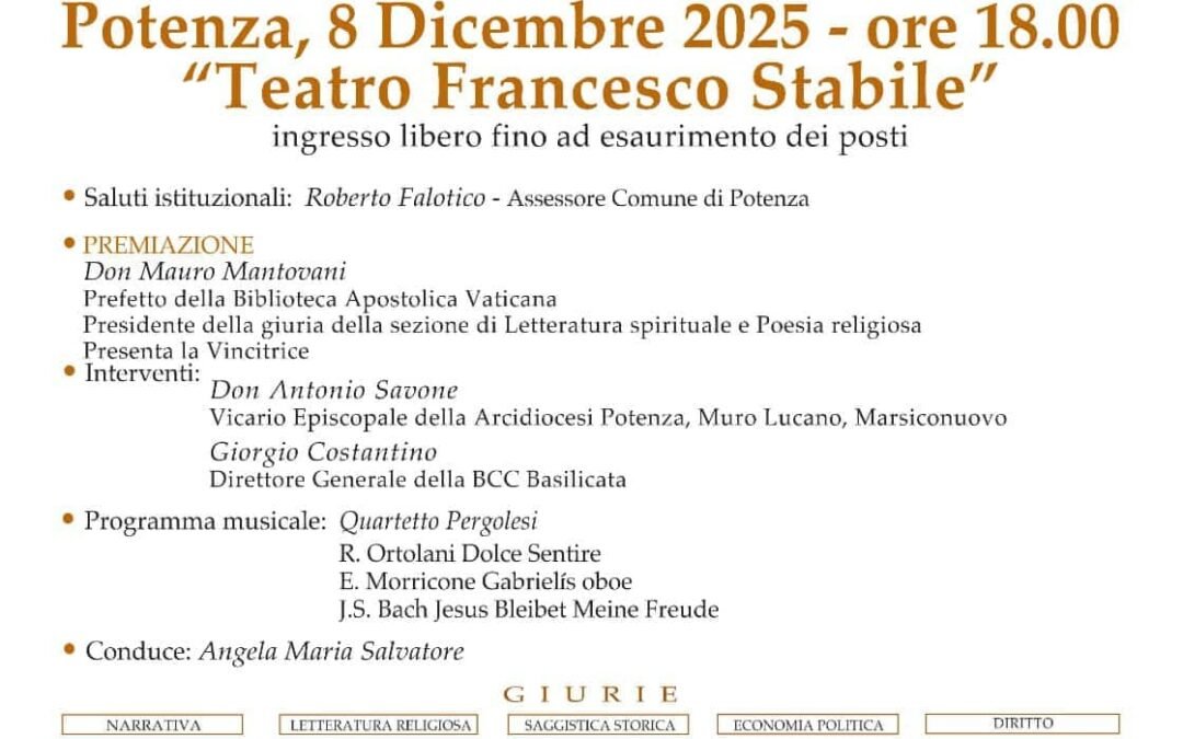 La Fondazione Premio Letterario Basilicata annuncia la cerimonia di premiazione della Sezione di Letteratura spirituale e Poesia religiosa della 54ª edizione del Premio, in programma l’8 dicembre 2025 alle ore 18.00 nel prestigioso Teatro “Francesco Stabile” di Potenza.