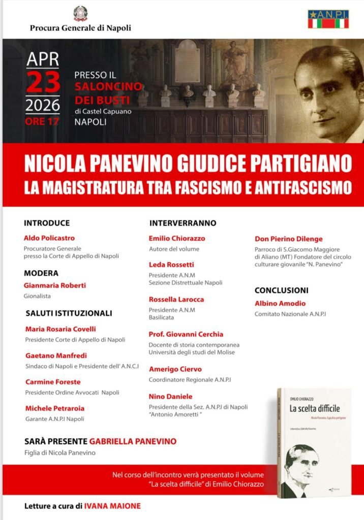 La Procura Generale di Napoli, in collaborazione con l’Anpi, l’Associazione Nazionale Partigiani d’Italia promuove un momento di riflessione storica e civile dedicato a Nicola Panevino, magistrato e partigiano legato ad Aliano, figura chiave della Resistenza. L’incontro “Nicola Panevino, giudice partigiano. La magistratura tra fascismo e antifascismo” si terrà domani, giovedì 23 aprile alle ore 17.00 presso il Saloncino dei Busti di Castel Capuano a Napoli. L’iniziativa intende approfondire il ruolo della magistratura nel passaggio dal regime fascista alla costruzione dello Stato democratico, attraverso la vicenda personale e professionale di Nicola Panevino, simbolo di impegno civile e integrità istituzionale. Apre i lavori Aldo Policastro, Procuratore Generale presso la Corte di Appello di Napoli, modera Gianmaria Roberti, giornalista. Previsti i saluti istituzionali di Maria Rosaria Covelli, presidente della Corte di Appello di Napoli, Gaetano Manfredi, sindaco di Napoli e presidente Anci, Carmine Foreste, presidente dell’Ordine degli Avvocati di Napoli e Michele Petraroia, Garante Anpi Napoli . In programma gli interventi di Emilio Chiorazzo, autore del volume “La scelta difficile” dedicato alla figura di Nicola Panevino, Leda Rossetti, presidente Anm – sezione distrettuale di Napoli, Rossella Larocca, presidente Anm Basilicata, Giovanni Cerchia, docente di Storia contemporanea presso l’Università degli Studi del Molise, Amerigo Ciervo, coordinatore regionale Anpi, Nino Daniele, presidente della sezione Anpi di Napoli “Antonio Amoretti” e don Pierino Dilenge, parroco di S. Giacomo Maggiore di Aliano e fondatore del circolo culturale giovanile “N. Panevino”. Sarà inoltre presente il sindaco di Aliano Luigi De Lorenzo insieme all’Amministrazione Comunale, a testimonianza del forte legame tra la comunità lucana e la figura di Nicola Panevino, sepolto per volontà della famiglia nel cimitero di Aliano. Le conclusioni sono affidate ad Albino Amodio, del Comitato Nazionale Anpi. .“Nicola Panevino scelse Aliano due volte. La prima quando, bambino, correva tra questi calanchi al seguito di un padre che qui serviva lo Stato come segretario comunale – spiega il sindaco De Lorenzo – la seconda quando, da uomo, volle che le sue spoglie tornassero in questa terra per il riposo definitivo. Non morì ad Aliano. Morì a Cravasco, il 23 marzo 1945, davanti a un plotone tedesco. Aveva 34 anni. Era un giudice del Tribunale di Savona che aveva trasformato la toga in un atto di resistenza. Con il nome di battaglia ‘Silva’ presiedeva il CLN, scriveva alle formazioni partigiane, salvava vite. Poteva tacere. Scelse di parlare con le sentenze, con il carcere, con il sangue. La sua lapide, nel nostro piccolo cimitero, non guarda solo Carlo Levi. Guarda ogni ragazzo che passa e gli chiede: da che parte stai quando la legge diventa ingiusta? Aliano custodisce quella domanda. E custodisce la risposta che Panevino diede. Per questo oggi siamo a Napoli. Perché la memoria non è nostalgia. È un mandato. E un paese di 900 anime ha il dovere di ricordare all’Italia che la Repubblica è nata anche così: da un magistrato lucano che a Savona difese la Costituzione prima che fosse scritta”. All’incontro sarà inoltre presente Gabriella Panevino, figlia del magistrato. L’evento sarà arricchito da letture a cura di Ivana Maione. Un appuntamento aperto alla cittadinanza, rivolto a studiosi, operatori del diritto e a tutti coloro che intendono approfondire una pagina fondamentale della storia repubblicana e del ruolo della magistratura nella difesa dei valori democratici.