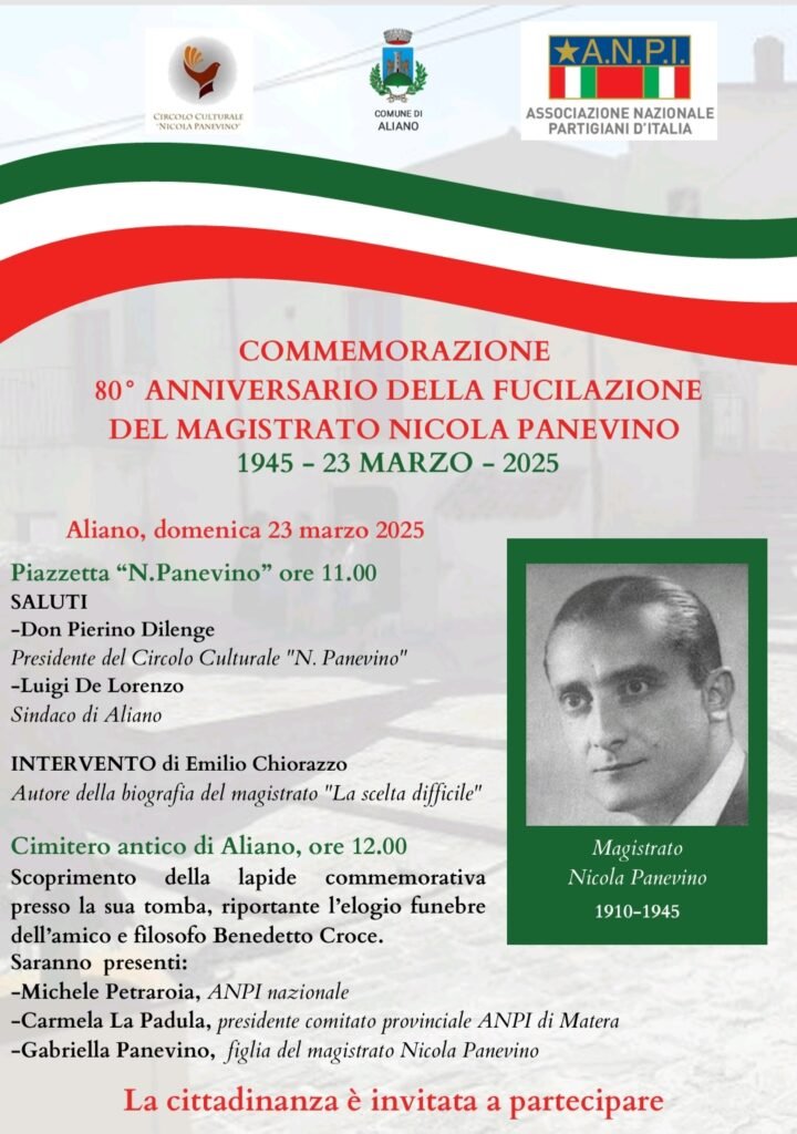 Domenica 23 marzo, dalle ore 11, nel comune di Aliano si terrà la Commemorazione dell’80° anniversario della fucilazione del magistrato Nicola Panevino.