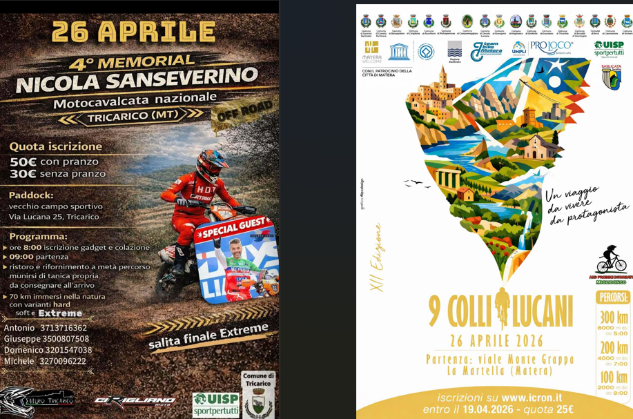 Un fine settimana nel segno dello sportpertutti e della promozione del territorio. Il 26 aprile il Comitato Territoriale UISP di Matera sarà protagonista con due appuntamenti che interpretano pienamente i valori associativi: la XII edizione della Nove Colli Lucani, con partenza da Borgo La Martella, e il 4° Memorial Nicola Sanseverino – Motocavalcata nazionale, in programma a Tricarico (Matera). Due eventi diversi per disciplina, ma uniti dalla stessa visione di sport come esperienza accessibile, sostenibile e di comunità, capace di mettere al centro le persone e i territori.