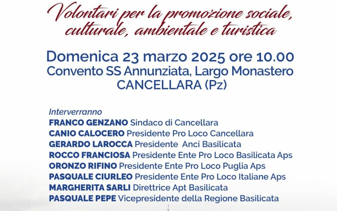 E’ in programma domenica 23 marzo 2025 alle ore 10 a Cancellara (Pz) presso il Convento SS Annunziata in Largo Monastero l’Assemblea regionale di Ente Pro Loco Basilicata Aps, l’organismo di rappresentanza, coordinamento ed assistenza delle Pro Loco, riconosciuto dalla Regione Basilicata e dall’Apt Basilicata, iscritto all’Albo della legge regionale 7 del 2008 e al Runts – registro unico nazionale terzo settore. “Volontari per la promozione sociale, culturale, ambientale e turistica” è il tema dell’appuntamento annuale scelto quest’anno da Ente Pro Loco Basilicata Aps, affiliato alla Rete associativa Terzo Settore Ente Pro Loco Italiane Aps, per porre al centro l’attività straordinaria di volontariato portata avanti da migliaia di