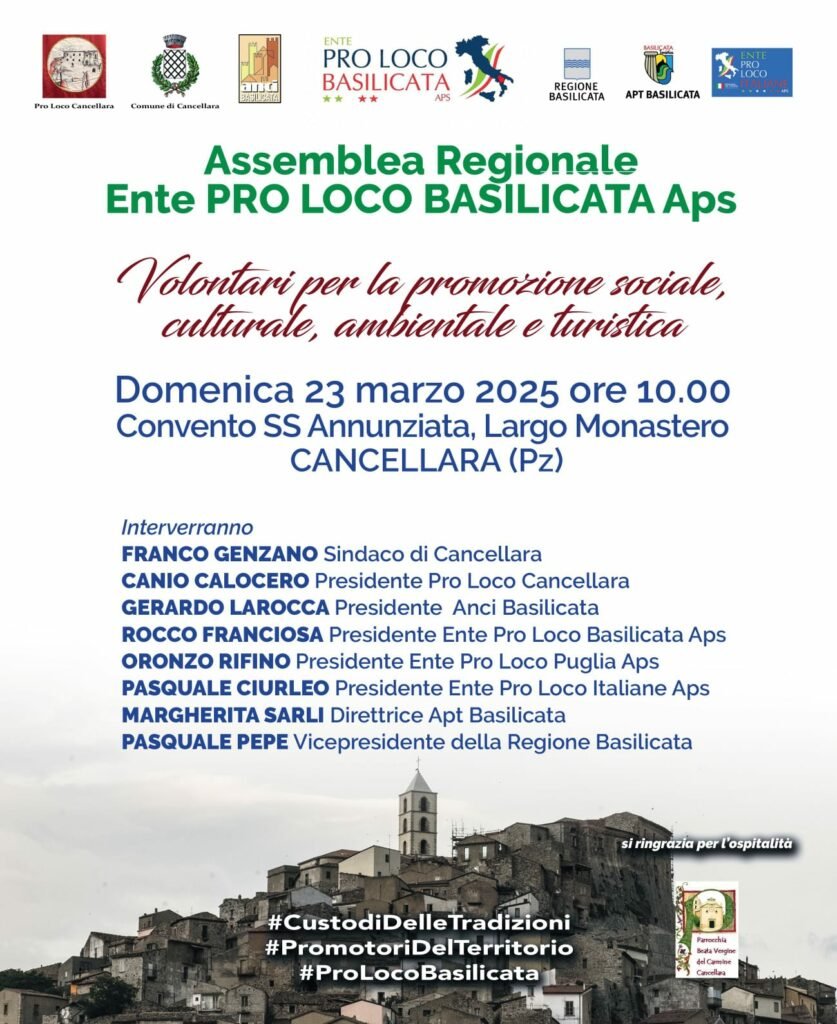 cittadine e cittadini lucani quali promotori del territorio e custodi delle tradizioni, al quale prenderanno parte autorevoli rappresentanti istituzionali regionali. A farlo sapere il Presidente regionale Ente Pro Loco Basilicata Aps Rocco Franciosa il quale sottolinea “l’assemblea regionale rappresenta il momento più importante per l’ente in cui si esamina il rendiconto economico dell’anno precedente e ci si confronta sulla programmazione futura delle attività con gli associati e le istituzioni che ringraziamo per la loro sensibilità istituzionale ed il supporto prezioso per lavorare su obiettivi comuni nell’interesse dello sviluppo sociale ed economico delle comunità”. All’assemblea regionale Ente Pro Loco Basilicata Aps prenderanno parte il sindaco di Cancellara Franco Genzano, il Presidente della Pro Loco Cancellara Aps Canio Calocero, il Presidente Anci Basilicata Gerardo Larocca, il Presidente regionale Ente Pro Loco Basilicata Aps Rocco Franciosa, il Presidente Ente Pro Loco Puglia Oronzo Rifino, il Presidente nazionale Ente Pro Loco Italiane Aps Pasquale Ciurleo, il Direttore Apt Basilicata Margherita Sarli e il vicepresidente della Regione Basilicata Pasquale Pepe. Saranno presenti inoltre i Presidenti delle Pro Loco e degli enti lucani affiliati alla Rete Associativa Terzo Settore Epli Aps. In occasione dell’assemblea regionale dopo la discussione e approvazione del rendiconto per cassa modello d anno 2024 dell’Ente Pro Loco Basilicata Aps e del bilancio di previsione per l’anno 2025 è prevista una degustazione di prodotti tipici locali presso il ristorante The Golden Hen Castle e la visita guidata alla Chiesa di Santa Caterina D’Alessandria candidata a “I luoghi del cuore Fai” ed al centro storico di Cancellara (Pz) inseriti anche nelle Giornate Fai di Primavera grazie all’impegno della volontaria Pro Loco Cancellara Marianna Lancellotti.