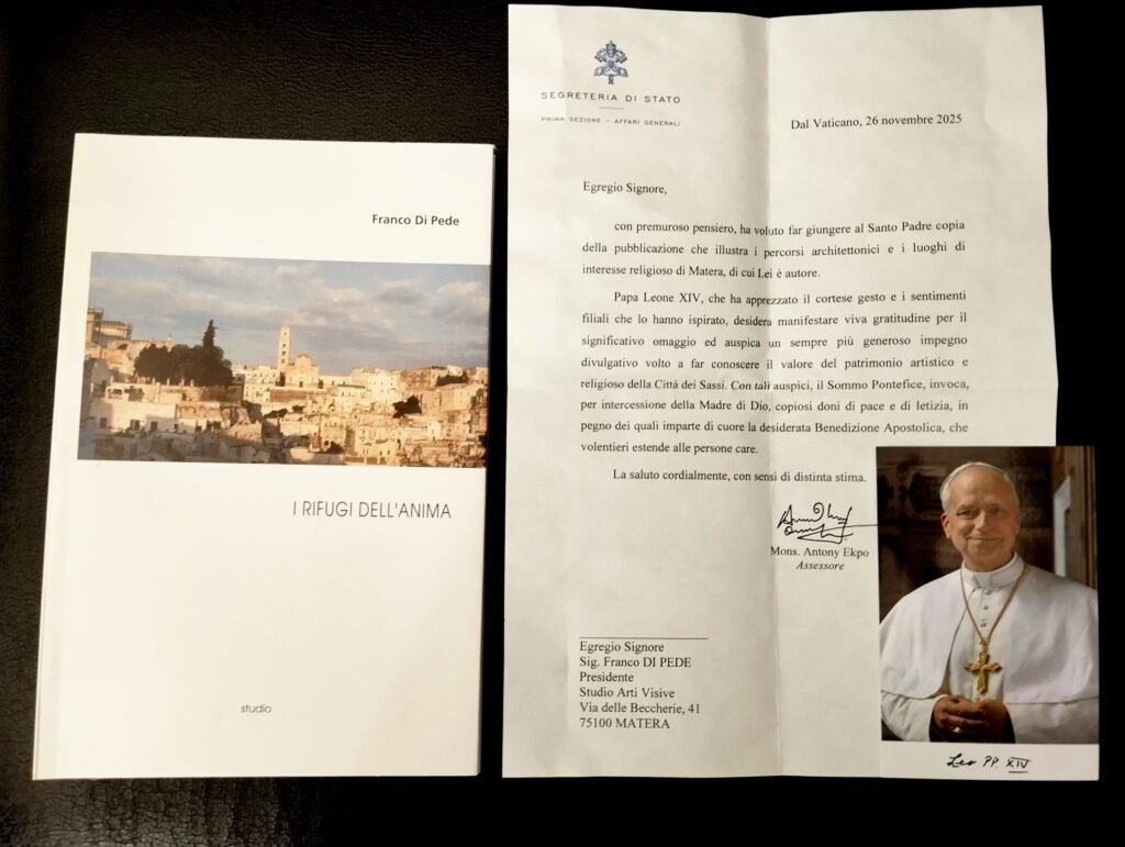 A conclusione del Giubileo 2025, l’artista materano Franco Di Pede ha fatto pervenire, tramite la segreteria personale, a Papa Leone XIV la prima copia di stampa del volume “I rifugi dell’anima”, realizzata per il Giubileo del 2000, accompagnata dal depliant illustrato sulla chiesa di Sant’Agostino in Matera e dall’invito a visitare le numerose altre chiese sparse nel territorio materano.