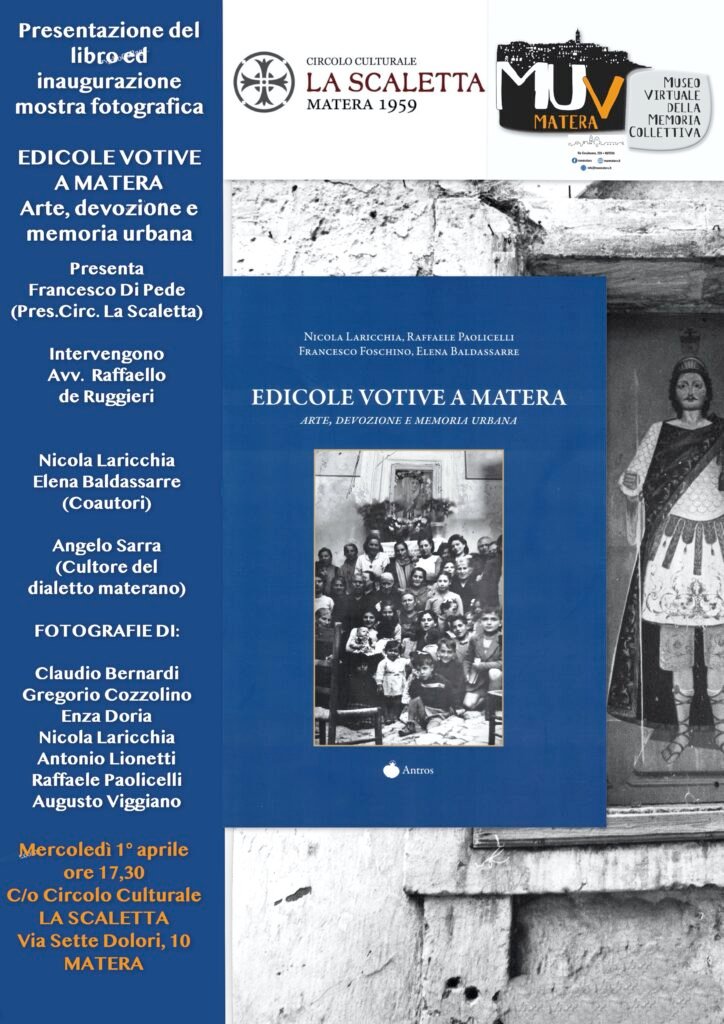 Mercoledì 1° aprile, alle ore 17,30 presso il Circolo Culturale LA SCALETTA, in Matera alla via Sette Dolori, 10 verrà presentato il volume “Edicole votive a Matera – Arte, devozione e memoria urbana” a cura di Nicola Laricchia, Raffaele Paolicelli, Francesco Foschino ed Elena Baldassarre, pubblicato dall’Editore Antros.