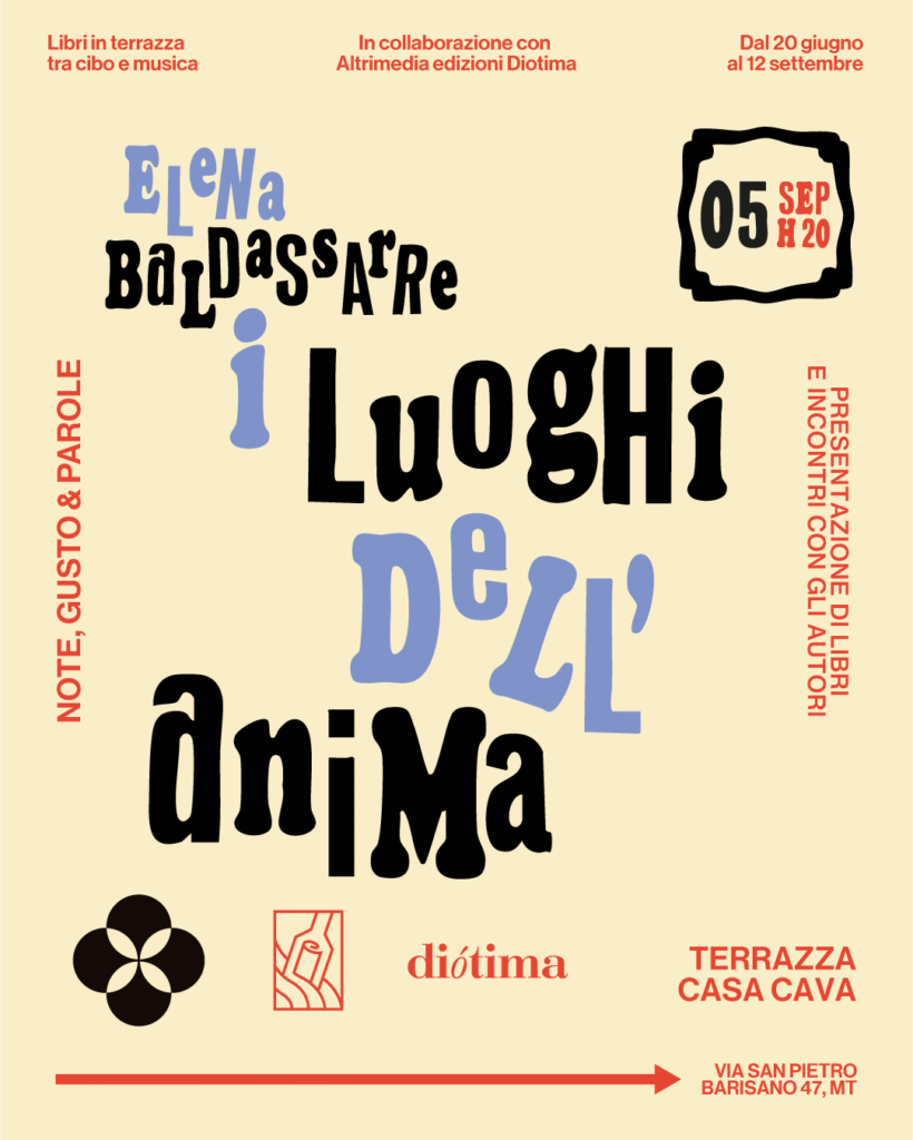 Il sesto appuntamento del cartellone estivo di Libri in terrazza “Note, Gusto & Parole” è previsto per venerdì 5 Settembre, appuntamento alle ore 20 presso la terrazza di Casa Cava, quando sarà presentato “I luoghi dell’anima. Storie, racconti, passeggiate tra le chiese di Matera” di Elena Baldassarre. L’iniziativa, che ha preso il via lo scorso 20 giugno e termina il 12 settembre è nata dalla collaborazione tra Altrimedia Edizioni e Residence San Pietro Barisano e intende sostenere la promozione della lettura e del libro e nel contempo occasioni di confronto che arricchiscano il parterre di offerte nell’ambito dell’intrattenimento culturale a beneficio di residenti e turisti. “I luoghi dell’anima. Storie, racconti, passeggiate tra le chiese di Matera” (Altrimedia Edizioni in collaborazione con Logos), di Elena Baldassarre, è una guida alla visita consapevole delle chiese di Matera per un visitatore che voglia andare oltre la bellezza delle forme e che sia disposto a immergersi nella città fino a entrare nel cuore religioso di questa nostra terra, attraverso un percorso ascensionale alla riscoperta del Sacro. Si suggeriscono itinerari orizzontali e verticali che offrono la possibilità di attraversare il territorio in tutte le sue dimensioni dando vita a un reticolo di suggestioni spaziali e spirituali.Seguendo i percorsi indicati, si ha l’idea di come la città e la sua coscienza religiosa siano andate man mano crescendo e di come sia possibile leggere ancora, scavati e incisi nel tufo, pietra pesante e friabile, i segni, ininterrotti nel tempo, della fede dei Materani. Il 12 settembre l’appuntamendo con “Teorema Boikena” di Giuseppe Dalessandro chiuderà la I edizione della rassegna per Libri in terrazza di “Note, Gusto & Parole”. ,