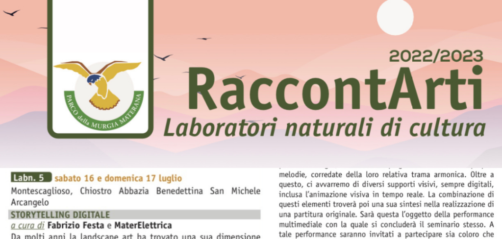 Si tratta di un seminario nel quale, attraverso l’uso di supporti digitali visivi e sonori, si realizzerà una mappatura dei luoghi del Parco della Murgia Materana, una vera e propria carta geografica musicale. A tale scopo verrà utilizzato un applicativo che permette di mappare percorsi e luoghi, trasformando gli itinerari in melodie, corredate della loro relativa trama armonica. Saranno disponibili anche diversi supporti visivi, sempre digitali, inclusa l’animazione visiva in tempo reale. La combinazione di questi elementi troverà poi una sua sintesi nella realizzazione di una partitura originale. Sarà questa l’oggetto della performance multimediale con la quale si concluderà il seminario.