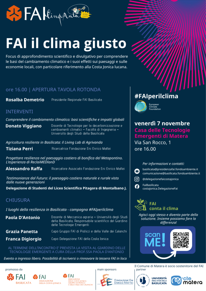 con inizio alle ore 10.00, a cura della Delegazione FAI della Costa Jonica, il percorso esperienziale Pantanello: luogo di adattamento e resilienza ambientale dall’epoca antica alle biotecnologie green accompagnerà i partecipanti nel cuore del Metapontino, presso l’azienda sperimentale Alsia Metapontum Agrobios. Attraverso le ricerche dell’archeologo Joseph Coleman Carter, a cura di narratori d’eccezione: il dott. Francesco Cellini, dirigente Area ricerche Alsia, il dott. Antonio De Siena, già Soprintendente Archeologico della Basilicata, il dott. Vincenzo Cracolici, direttore del Museo Archeologico Nazionale di Metaponto e il geologo e docente Gregorio Giannini, verranno illustrate le antiche reti idriche e i sistemi agricoli della Magna Grecia, messi in dialogo con le moderne tecniche di gestione sostenibile delle risorse e dell’acqua, con un focus sulle criticità e i cambiamenti climatici nella Costa Jonica. Al termine della presentazione ci sarà una visita con i narratori dell’Area Archeologica “Pantanello” e dei laboratori del Centro Ricerche “Metapontum Agrobios”.