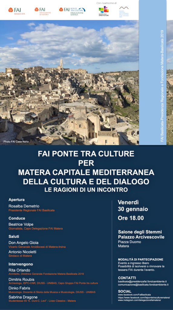 Dopo l’apertura della Presidente Regionale FAI Basilicata, Rosalba Demetrio, i saluti del Vicario Generale dell’Arcidiocesi di Matera-Irsina, Don Angelo Gioia e del Sindaco di Matera, Antonio Nicoletti, interverranno l’architetto Rita Orlando, Direttrice Generale Fondazione Matera-Basilicata 2019, l’archeologo Dimitris Roubis, ISPC – CNR, DIUSS – Unibas, Capogruppo FAI Ponte tra culture, il Prof. Dinko Fabris, Musicologo, Docente di Storia della Musica e Musicologia – Unibas, la Studentessa Sabrina Dragone, IIS “E. Duni-C. Levi” – Liceo Classico.